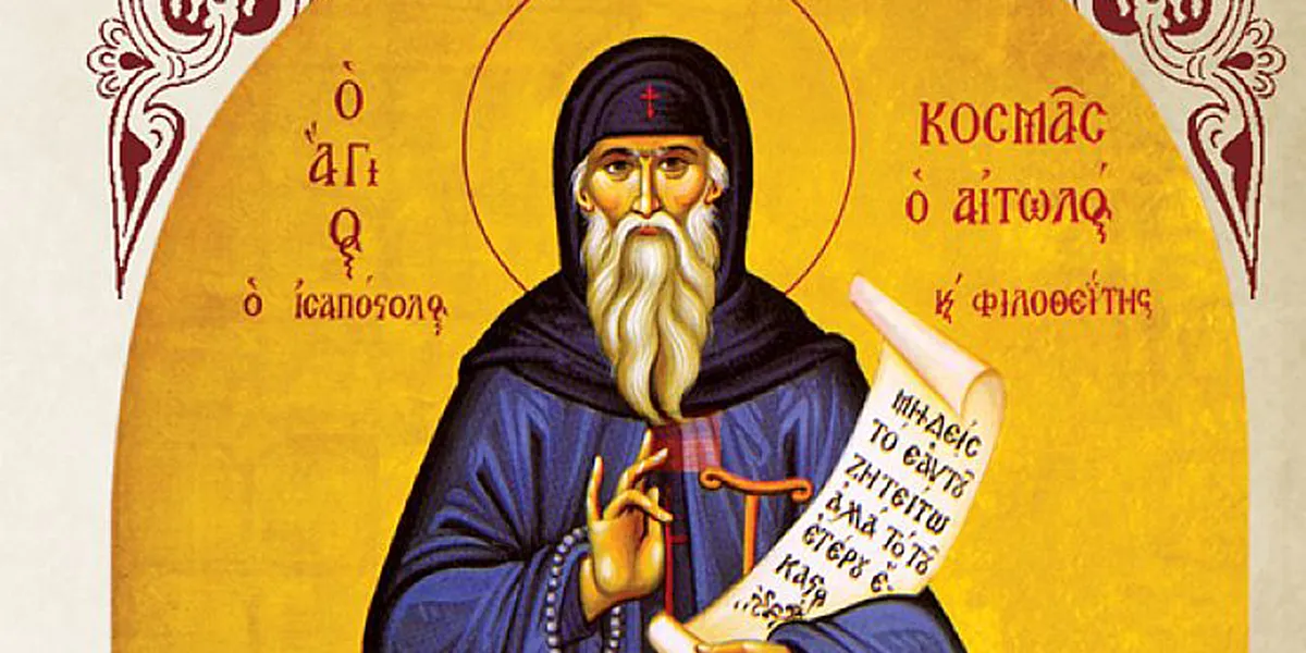 Σήμερα, ἀγαπητοί μου, ἑορτάζει καὶ πανηγυρίζει ὁ ἰσαπόστολος καὶ ἐθναπόστολος ἅγιος Κοσμᾶς ὁ Αἰτωλός. Ὁ ὑμνογράφος ἀπορεῖ τί ἐγκώμια νὰ τοῦ πλέξῃ καὶ λέει· Πῶς νὰ σὲ ὀνομάσουμε, ἅγιε Κοσμᾶ; μάρτυρα, ἢ ἀπόστολο, ἢ μοναστή, ἢ ἱερέα τοῦ Ὑψίστου;